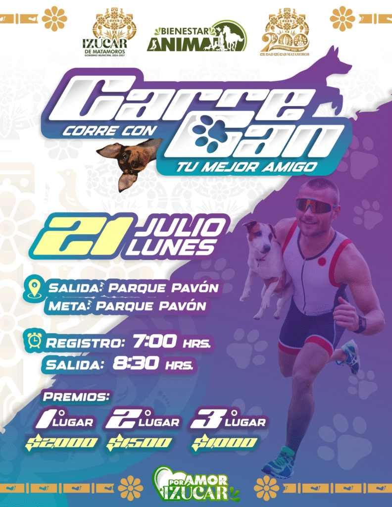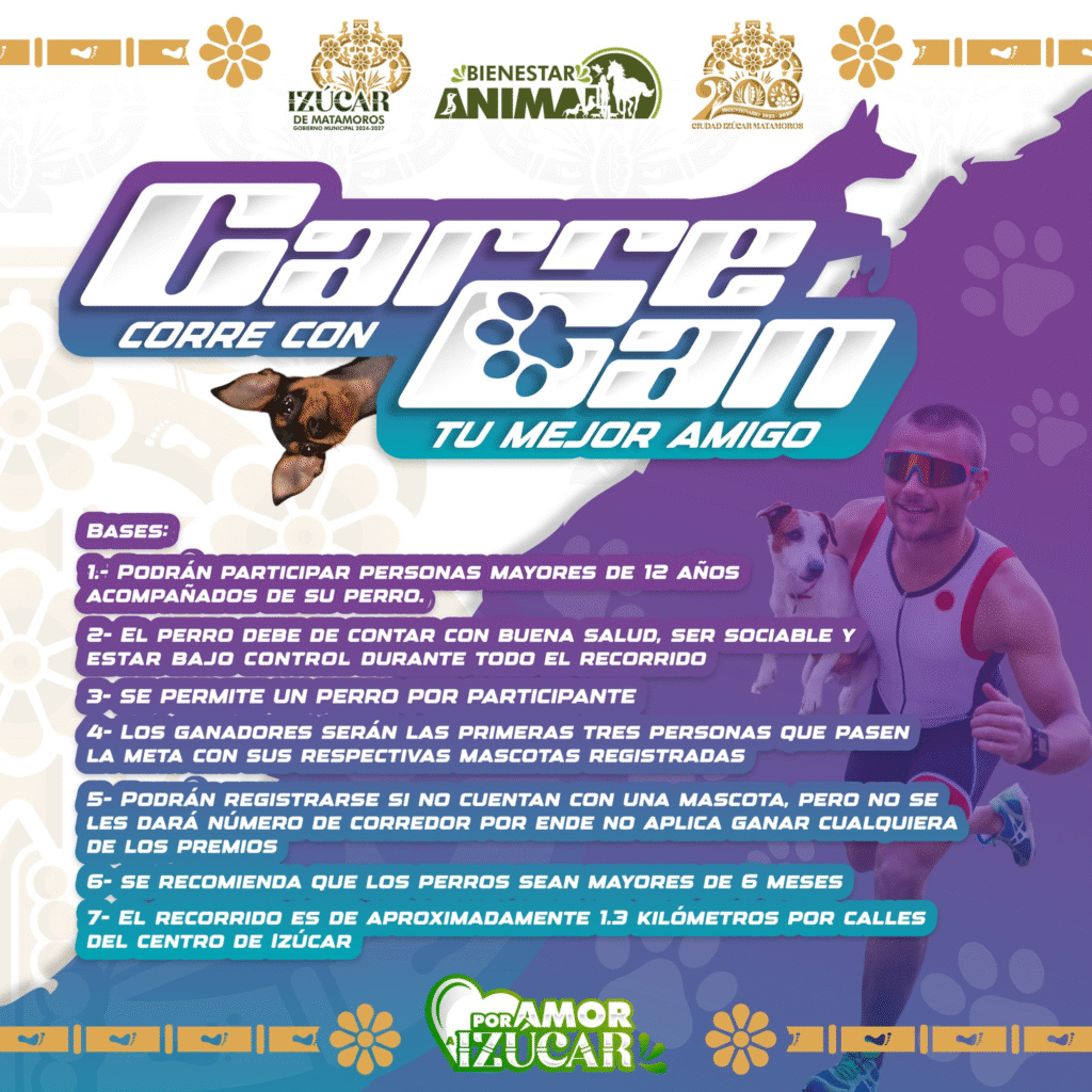 El Gobierno Municipal de Izúcar de Matamoros, a través de la Dirección de Bienestar Animal, convoca a todas las familias del municipio a participar en el evento “CarreCan: Corre con tu mejor amigo”, una jornada dedicada a celebrar la amistad y el cuidado responsable de los animales de compañía, en el marco del Día Mundial del Perro.
