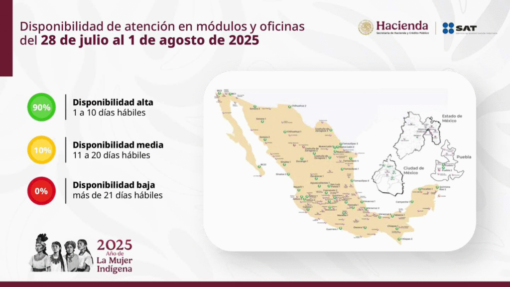 El Servicio de Administración Tributaria (SAT) informó que para la semana del 28 de julio al 1 de agosto, se reporta una alta disponibilidad de citas para atención presencial en sus módulos y oficinas desconcentradas ubicadas en las 32 entidades federativas.