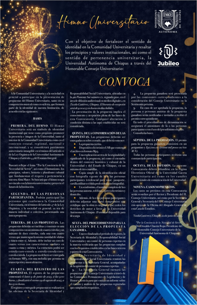 Tuxtla Gutiérrez, Chiapas. – La Universidad Autónoma de Chiapas invita a participar en la convocatoria para la composición de la música y letra del himno que represente a la institución. La composición tiene como propósito fortalecer el sentido de identidad en la comunidad universitaria, en el contexto estatal, nacional e internacional, además de resaltar los principios y valores institucionales y el sentido de pertenencia.