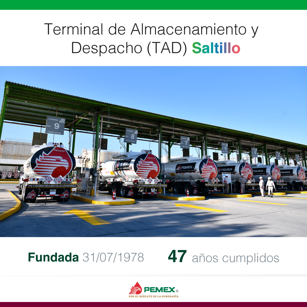 Petróleos Mexicanos (Pemex) conmemoró el 47 aniversario de la Terminal de Almacenamiento y Despacho (TAD) de Saltillo, en el estado de Coahuila, destacando su papel estratégico en la cadena logística nacional de combustibles, así como su eficiencia operativa al servicio del país.