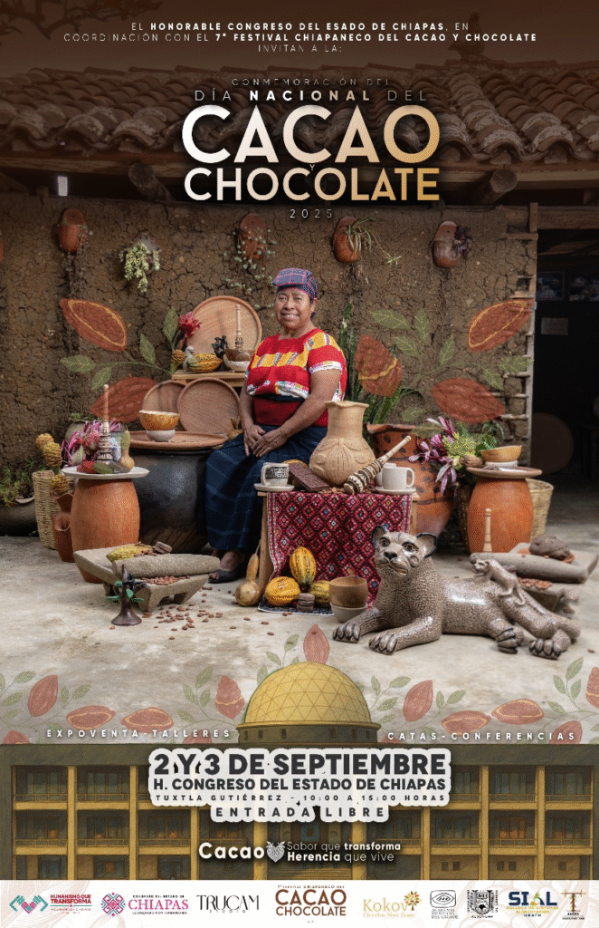 El Honorable Congreso del Estado de Chiapas, en coordinación con el 7° Festival Chiapaneco del Cacao y Chocolate, invita a la ciudadanía a celebrar el Día Nacional del Cacao y Chocolate 2025. El evento se llevará a cabo los días 2 y 3 de septiembre en la sede del Poder Legislativo, ubicada en la 1ª Sur Oriente y Calle Central, en Tuxtla Gutiérrez. La entrada será libre para todo el público.
