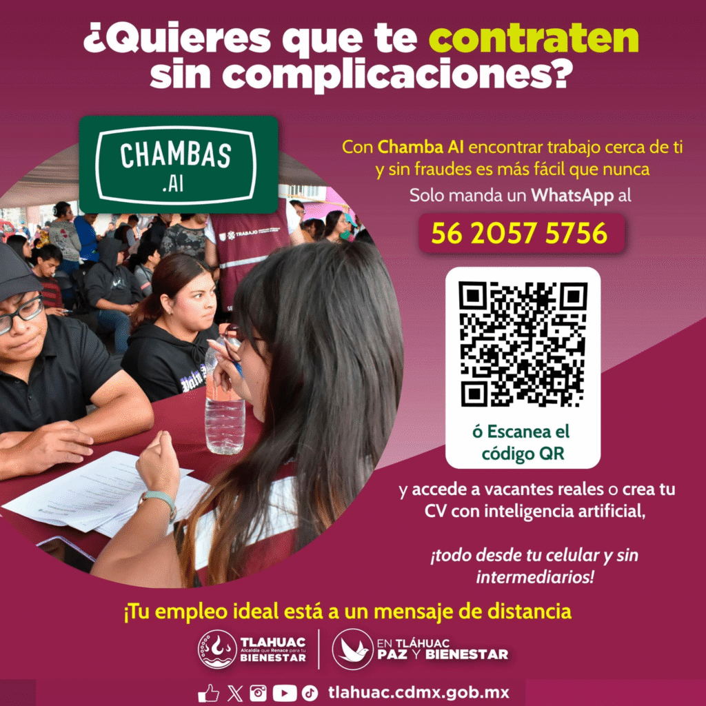 La Alcaldía Tláhuac presentó la herramienta digital Chamba AI, una plataforma que facilita la búsqueda de empleo de manera segura, rápida y sin intermediarios, permitiendo a las y los usuarios encontrar vacantes cercanas o elaborar su currículum con inteligencia artificial desde su teléfono celular.