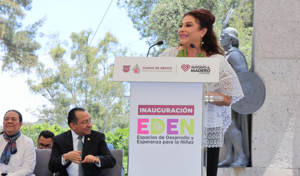 La Jefa de Gobierno de la Ciudad de México, Clara Brugada Molina, encabezó la inauguración del primer Espacio de Desarrollo y Esperanza para la Niñez (EDEN) en el Parque del Mestizaje, que inspirado en las Utopía cuenta con tirolesas, pista BMX, carrusel, trenecito, arenero, velaria cultural, fuentes y esculturas restauradas, así como parque canino, entre otros servicios.