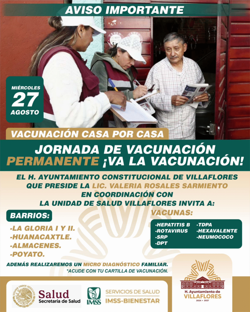 El Ayuntamiento Constitucional de Villaflores, que encabeza la alcaldesa Valeria Rosales Sarmiento, en coordinación con los Servicios de Salud IMSS-Bienestar, anunció el inicio de una jornada permanente de vacunación casa por casa. Esta estrategia busca acercar los servicios de salud a todas las familias del municipio, garantizando acceso a la prevención y cuidado médico.