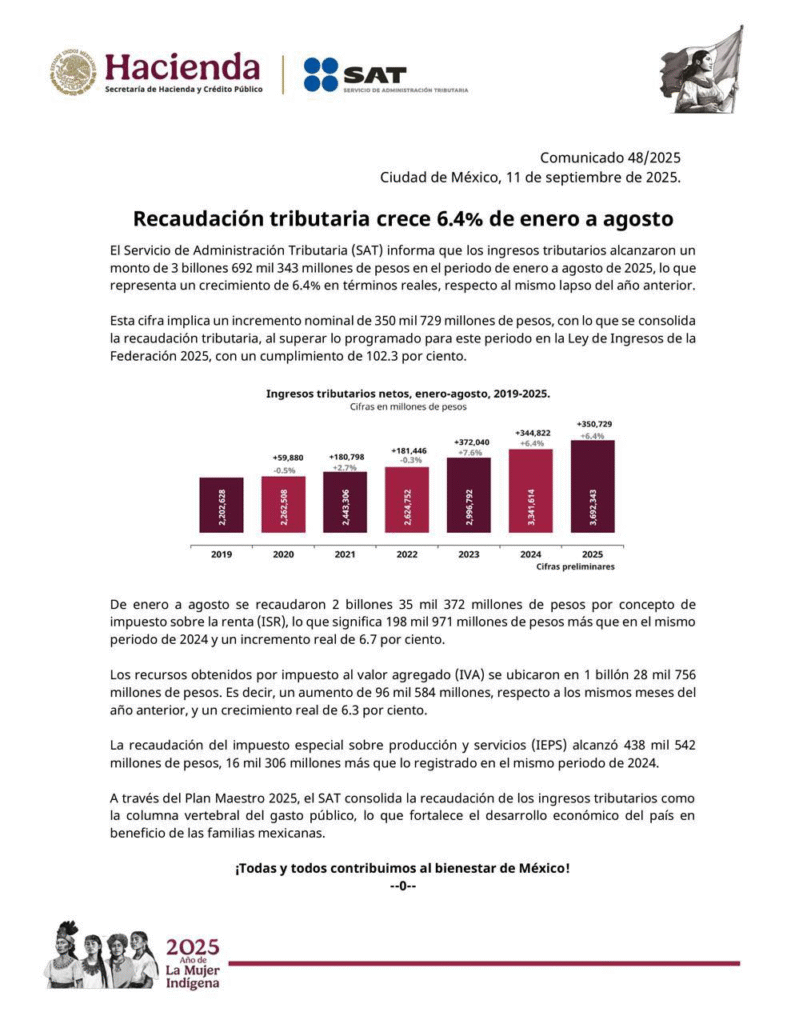 El Servicio de Administración Tributaria (SAT) informó que, entre enero y agosto de 2025, los ingresos tributarios alcanzaron 3 billones 692 mil 343 millones de pesos, cifra que representa un crecimiento real de 6.4 por ciento en comparación con el mismo periodo del año pasado.