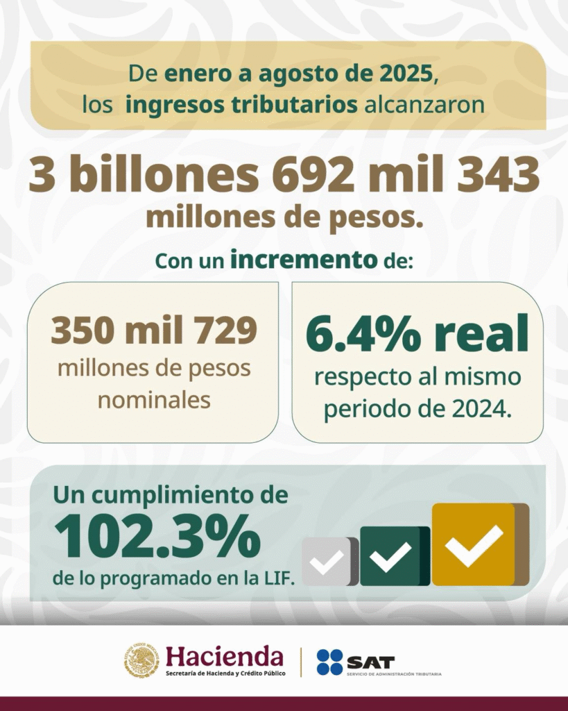 El Servicio de Administración Tributaria (SAT) informó que, de enero a agosto de 2025, la recaudación tributaria alcanzó un crecimiento histórico que permitió superar lo establecido en la Ley de Ingresos de la Federación.