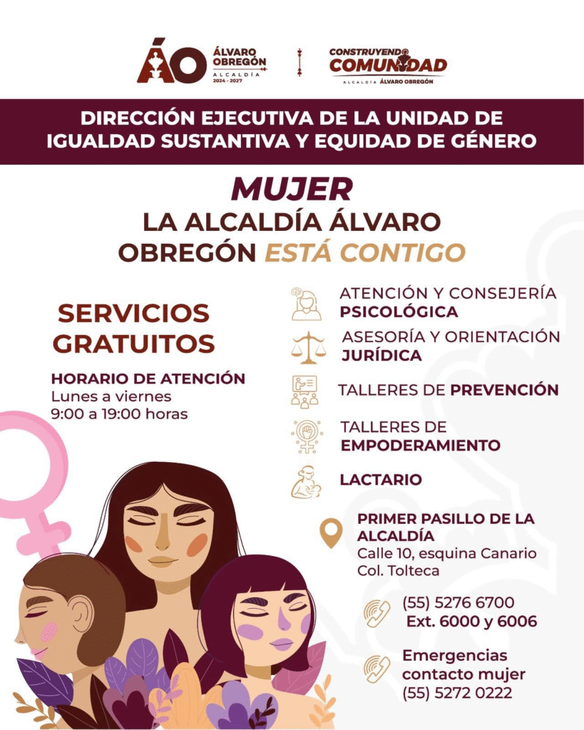 La Alcaldía Álvaro Obregón informó que, a través de la Dirección de Igualdad y Equidad de Género, se impulsan acciones permanentes para garantizar el bienestar de las mujeres, mediante la oferta de servicios gratuitos orientados a acompañar, apoyar y fortalecer sus derechos.
