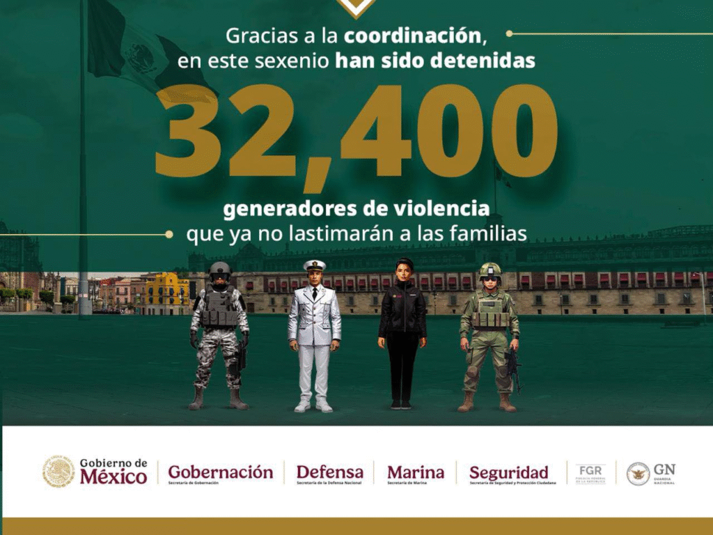La Secretaría de Seguridad y Protección Ciudadana (SSPC) informó que, como resultado de las acciones coordinadas del Gabinete de Seguridad del Gobierno de México, se ha logrado la detención de 32,400 generadores de violencia, lo que representa un avance significativo en la construcción de un país más seguro.