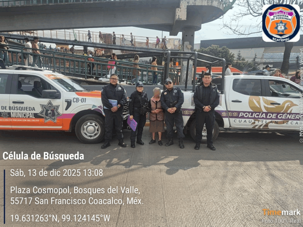 Elementos de la Unidad de Género identificaron a la mujer de 80 años en el municipio de Coacalco de Berriozábal. La adulta mayor manifestó ser originaria de Cuautitlán Izcalli, por lo que se activó de inmediato el protocolo de localización mediante la Célula de Búsqueda.