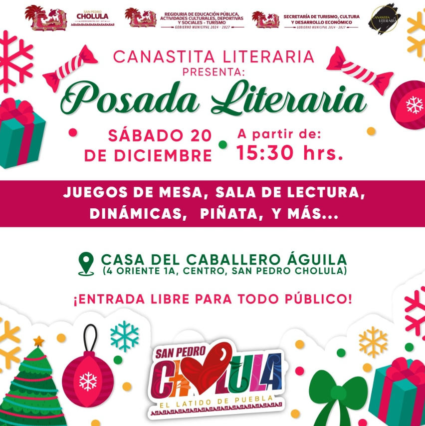El Gobierno Municipal de San Pedro Cholula invita a la ciudadanía a participar en la Posada Literaria, que se llevará a cabo este sábado 20 de diciembre a partir de las 15:30 horas en la Casa del Caballero Águila, ubicada en la 4 Oriente 1A, en el Centro Histórico del municipio.