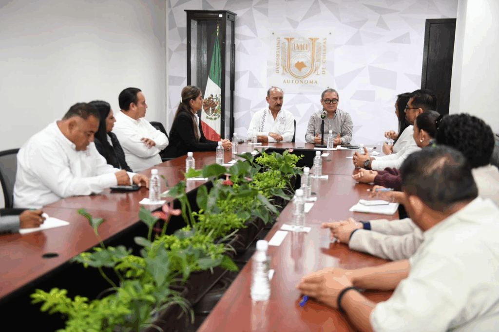 Por la UNACH, la coordinadora General de Relaciones Interinstitucionales, Rocío Moreno Vidal; el director de la Escuela de Ciencias Químicas, Abumalé Cruz Salomón; el coordinador de la Licenciatura en Caficultura, Víctor Manuel Aguilar Castillo; la secretaria Técnica de la Secretaría Académica, Dolores Natividad López Sánchez, la directora de la Defensoría de los Derechos Humanos y Universitarios, Joseana Beetzabe de la Rosa Celaya y el director de Asuntos Jurídicos, José Juan Pérez Ramos.