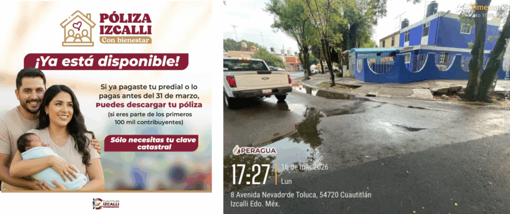 El Gobierno Municipal de Cuautitlán Izcalli informó que, tras la lluvia de ligera a mediana intensidad registrada este 16 de marzo, con intervalos de granizo en algunas zonas, no se reportan afectaciones en colonias ni vialidades del municipio.