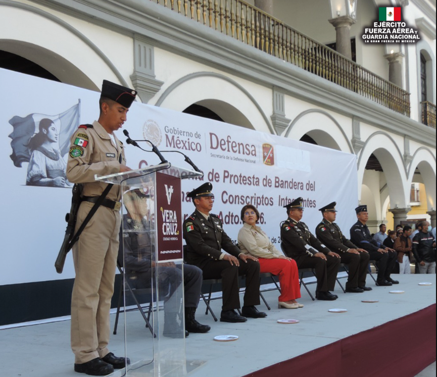 La Secretaría de la Defensa Nacional (Sedena) llevó a cabo la ceremonia de Toma de Protesta de Bandera del personal del Servicio Militar Nacional, correspondiente al primer escalón de adiestramiento, en el Zócalo de la ciudad y puerto de Veracruz.