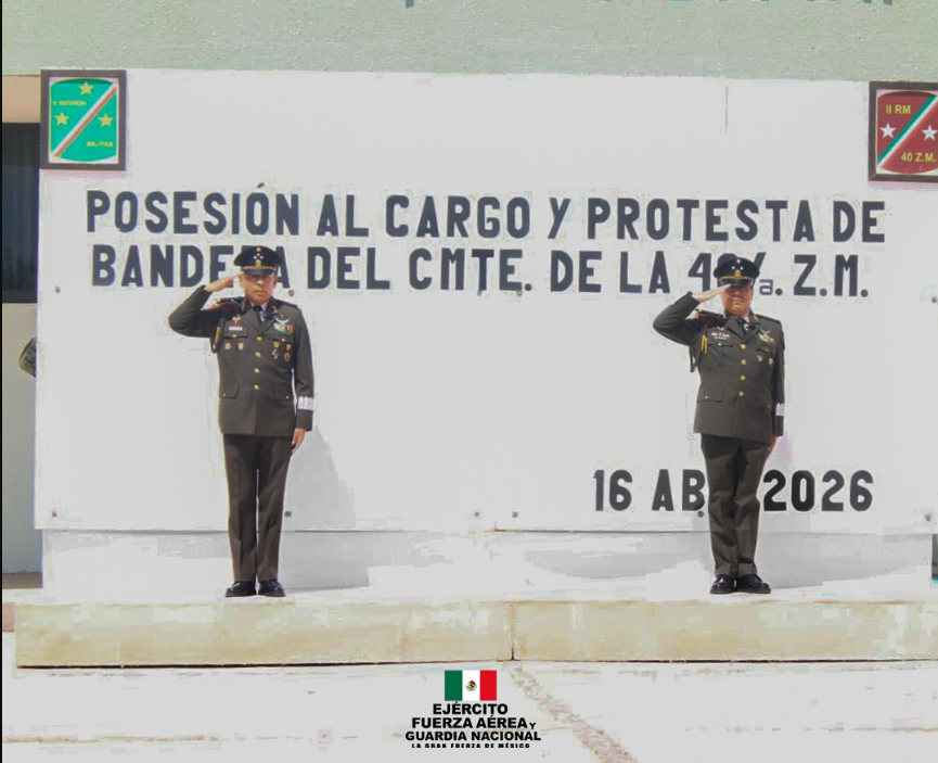 La Secretaría de la Defensa Nacional informó que el pasado 16 de abril de 2026 se llevó a cabo la ceremonia de toma de protesta, posesión al cargo y protesta de bandera del nuevo comandante de la 40/a Zona Militar, en las instalaciones del Campo Militar No. 40-A, en Guerrero Negro, Baja California Sur.